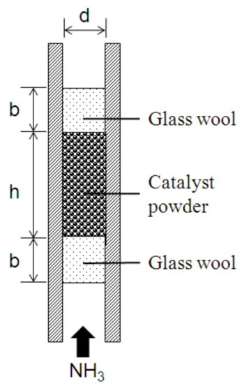 The cross-section of the tubular fixed-bed reactor is shown in Figure 9. The material used for the reactor is the stainless steel 316, and the inner and outer diameters of reactor are 1/8 inch and 1/4 inch, respectively. The tube is filled with Ru-Cs/C catalyst particles with a height of h. The value of h for the total loading of Ru-Cs/C catalyst is 0.107 g (74.6 mg of Ru/C and 32.4 mg of CsNO3), and the height is about 3.1 cm. The catalyst particles are fixed in space by glass wool placed on the top and bottom of the catalyst bed. The height b of glass wool is about 0.8–1 cm. The up-flow of ammonia gas through the reactor is arranged.