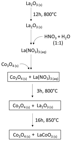 The catalyst was obtained from Co3O4 (POCH, Gliwice, Poland, pure) and lanthanum nitrate. In order to obtain lanthanum nitrate, lanthanum oxide (Fluka, St. Gallen, Switzerland, pure) was calcined at 800 °C for 12 h, cooled and dissolved in a 1:1 aqueous solution of nitric acid (POCH, Gliwice, Poland, 65% pure for analysis). Cobalt oxide was added to the solution. The resulting mixture was heated to approximately 800 °C for 3 h until lanthanum nitrate decomposed. Next, the mixture was heated in static air for approximately 16 h at 850 °C to allow for the reaction between Co3O4 and the even distribution of La2O3 (see Figure 1). The obtained solid was ground. For every 20.0 g of powder 1.0 g of ammonium carbonate (Riedel-de Haen, Seelze, Germany, pure) was added along with 0.3 g of glycerin (POCH, Gliwice, Poland, pure for analysis) in order to facilitate the formation of pellets. Both compounds decomposed entirely when the pellets were heated to 850 °C. The mixture was ground until it was homogeneous. Tablets (diameter 1.70 cm, height 0.3 cm) were pressed from the fraction below 0.4 mm. The force applied in two subsequent steps was 5 and 10 tons, respectively. Next, the tablets were calcined at 850 °C for 48 h, cooled, crushed and sieved.