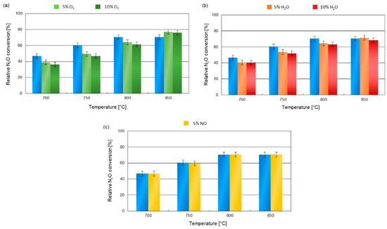 Nitrous oxide conversions in streams with different compositions: (a) 5 and 10 % O2 concentration, 5% N2O, Ar (b) 5 and 10% water vapor content, 5% N2O, Ar and (c) 5% N2O, Ar with and without 5% NO in the stream.
