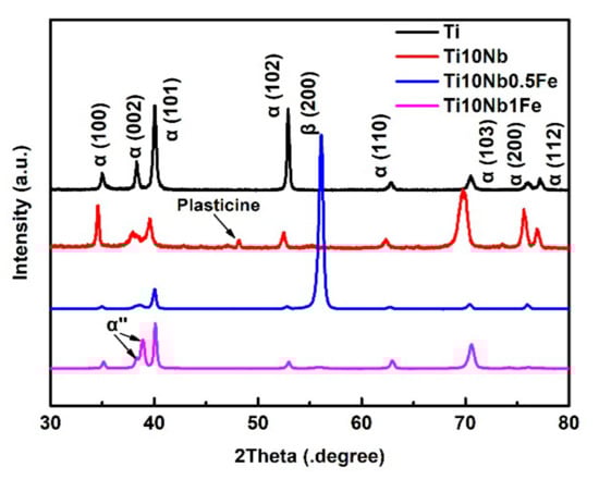 XRD patterns of pure Ti and Ti10NbxFe alloys.