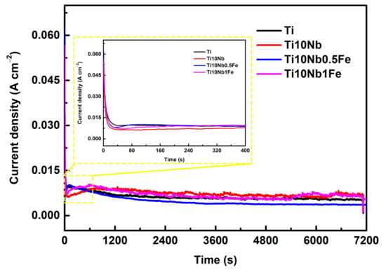 Figure 2 displays the real-time constant voltage anodization behavior of the Ti and Ti10NbxFe alloys, with the samples identified by their Nb and Fe content, which were anodized at 30 V in ethylene glycol (EG) electrolyte-containing 0.5 wt% NH4F and 5 vol% deionized water. Three stages can be identified in Figure 2, suggesting a porous oxide layer formed on the alloys. The sharp drop of the anodization current in the first 30 s was due to the formation of an initial layer of high-resistance barrier oxide, followed by a decrease to the minimum of the current due to the electrical resistance of the barrier oxide. Despite the porosity induced by the presence of fluoride ions, the process was still dominated by the electrical resistance of the barrier oxide. The current subsequently rose to the maximum as pore nucleation progressed, which was due to a decrease in the resistance of the anodic film, as more paths for ionic species were available in the electrolyte. The current then gradually decreased to plateau at a steady-state value corresponding to the maximum nanotube length. Based on the field-assisted oxidation and dissolution models, it is believed that the steady state was reached because the rate of oxide formation at the metal/oxide interface and the rate of dissolution at the oxide/electrolyte interface were equal [].