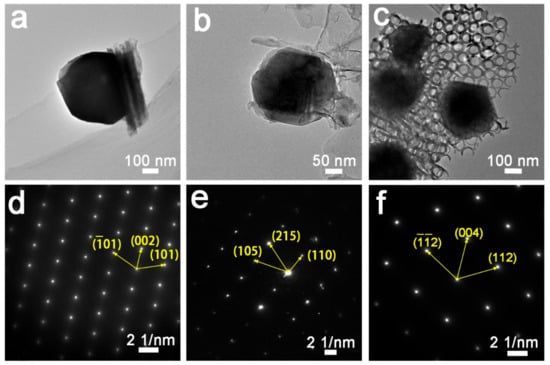 TEM was employed to investigate the microstructure of the annealed nanotubes based on Ti and the Ti10NbxFe alloy (Figure 5). All samples exhibited a tubular structure. TiA-450 shows the largest tube wall thickness of 24.11 nm, whereas smaller tube wall thicknesses of ~13.16, ~6.58, and ~6.02 nm were observed for the other three samples, respectively. These results, along with the SEM observations, make it clear that ordered self-organized tubes are easier to form on both pure Ti and the Ti10Nb-based alloy [,]. The diameter of the nanoparticles on Ti10NbA-450 was about 300 nm, while that of Ti10Nb0.5FeA-450 and Ti10Nb1FeA-450 were both about 200 nm, as shown in Figure 6a–c. The high-angle annular dark field scanning transmission electron microscopy (HADDF STEM) images and EDS mapping results of these nanoparticles are shown in Figure S6 and Table S1, indicating the nanoparticles are crystals of TiO2, doped with Nb and Fe. Selected area electron diffraction (SAED) examinations were carried out to further identify the phase structure of the nanoparticles (Figure 6). For the nanoparticles on Ti10NbA-450, the lattice fringe d-spacings of the SAED images were 0.35 nm, 0.47 nm, and 0.35 nm, corresponding to the (101), (002), and (10) planes of anatase TiO2 (PDF# 21-1272). These results are in line with the high-resolution TEM (HRTEM) image of the nanoparticles on Ti10NbA-450 shown in Figure S7. For the nanoparticles on Ti10Nb0.5FeA-450, the lattice fringe d-spacings were 0.26, 0.13, and 0.17 nm, corresponding to the (110), (215), and (105) crystal planes of anatase TiO2. For the nanoparticles on Ti10Nb1FeA-450, the lattice fringe d-spacings were 0.23, 0.24, and 0.23 nm, corresponding to the (112), (004), and (2) planes of anatase TiO2. The SAED images for the three kinds of particles revealed that the nanoparticles are single-crystal anatase TiO2, which is in agreement with the previous reports []. The corresponding XRD pattern of the Ti-Nb-Fe-O nanotubes further demonstrates the existence of anatase TiO2. The results above indicate that Nb and Fe doping can accelerate the crystallization of TiO2.