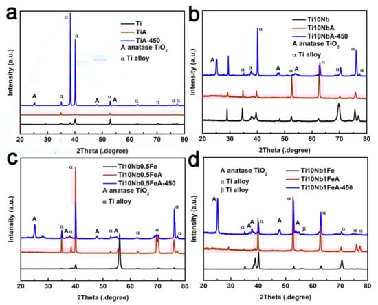 XRD patterns of Ti (a), Ti10Nb (b), Ti10NbxFe (c,d) alloys and nanotubes.