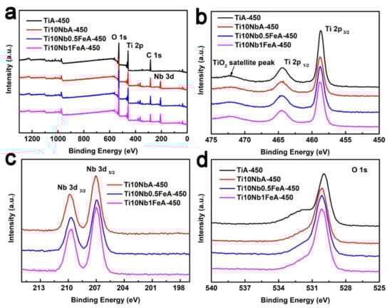 The chemical compositions of the TiO2 nanotubes, Ti-Nb-O nanotubes, and Ti-Nb-Fe-O nanotubes were evaluated by XPS. Figure 8 and Figure S9 show the XPS spectra of Ti and the Ti10Nb-based nanotubes after the annealing treatment. Figure 8a reveals the strong signals of the Ti, Nb, and O elements in the Ti-Nb-Fe-O nanotubes. For the O 1s core level spectra, two peaks were identified (Figure S9). In detail, the peak at 530.10 eV was due to the oxygen atoms bound to the metals, and the peak at 531.65 eV was associated with defect sites with low oxygen coordination. The area of the peak at 531.65 eV was larger for TiA-450 because of the smaller thickness of its nanotubes []. Figure 8b compares the core-level Ti 2p of different Ti and Ti10NbxFe-based nanotubes. The satellite peak at 472.00 eV was assigned to TiO2, indicating that the nanotubes based on Ti alloy are mainly composed of TiO2. The binding energy peaks of Ti 2p1/2 and Ti 2p3/2 for TiA-450 were centered at 464.4 and 458.6 eV, respectively. The binding energy peaks of Ti 2p1/2 and Ti 2p3/2 for the Ti-Nb-O and Ti-Nb-Fe-O nanotubes were a shift towards a higher binding energy compared to the TiO2 nanotubes. The binding energy peaks of Nb 3d3/2 and Nb 3d5/3 for the Ti-Nb-O nanotubes were centered at 209.8 and 207.0 eV, which are higher than those of the Ti-Nb-Fe-O nanotubes.