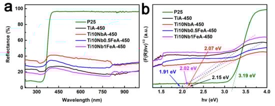 UV-vis diffuse reflectance spectra (a) and determination of the indirect interband transition energies (b) of P25, TiA-450, Ti10NbA-450, Ti10Nb0.5FeA-450 and Ti10Nb1FeA-450.