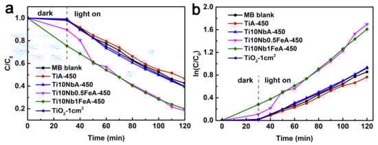 Photocatalytic degradation of MB under solar (λ > 400 nm) irradiation. (a): Ti, Ti10Nb and Ti10NbxFe alloy-based nanotubes under 450 °C heat treatment in air and TiO2 film with P25; (b) reaction kinetics (ln(C/C0) = −kapp ∗ t) of photoreaction, where k is the apparent first-order rate constant.