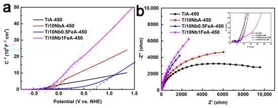To investigate the effects of Nb and Fe doping on the electrical properties of TiO2 nanotubes, electrochemical impedance measurements were conducted on the annealed TiO2, Ti-Nb-O, and Ti-Nb-Fe-O nanotubes. Figure 11a presents the Mott–Schottky plots derived from the electrochemical impedance at each potential with 1000 Hz frequency under dark conditions []. The Mott–Schottky equation correlates the capacitance C vs. the applied voltage E at a semiconductor/electrolyte interface under depletion conditions [,]. Based on the Mott–Schottky equation, the density of donors can be evaluated from the slope of 1/C2 vs. E, where C is determined from the imaginary component of the impedance in the electrochemical impedance spectroscopy (EIS) []. All samples in Figure 11 exhibited a positive slope, confirming n-type doping. The flat band potential (EFB) values for the TiO2 nanotubes, Ti-Nb-O nanotubes, Ti-Nb-(0.5)Fe-O nanotubes, and the Ti-Nb-(1)Fe-O nanotubes were −0.475, −0.325, 0.683, and −0.196 V, respectively. The positive EFB shift of the Ti-Nb-O and Ti-Nb-Fe-O nanotubes demonstrated the stronger bending of the band edge, which was favorable for the transportation of photogenerated electrons. Moreover, the carrier concentration (ND) of the photoelectrodes could be calculated according to the following equation [].