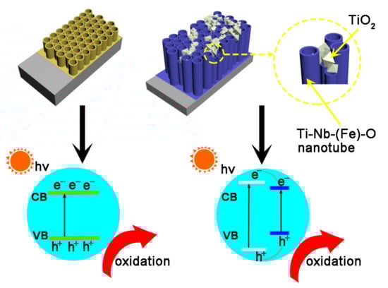 According to the discussion above, the Ti-Nb-Fe-O nanotubes displayed an enhanced separation rate of charge carriers and improved solar light response. The single-crystal TiO2 and nanotubes form a type II heterojunction according to the band structure, as presented in Figure 12. Firstly, longer nanotubes can enhance the contact area with organic pollutants. Then the positive EFB can accelerate the transportation of electrons, thus improving the charge separation. Moreover, a large number of oxygen vacancies, which were inducted into the nanotubes due to the Nb, Fe doping, can reduce the bandgap energy of the nanotubes, and further extend the light response.