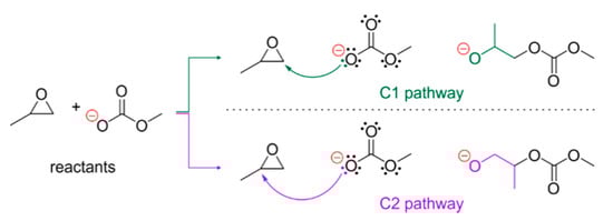 Possible pathways for coupling reaction of 1,2-epoxypropane and methylcarbonate. Two products can be potentially formed due to the attack of the nucleophile on either methylene or methine carbon atom (C1 and C2 pathway, respectively).