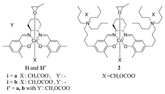 The systems considered in the present work are shown in Figure 4. We focus our attention on the bifunctional CO2/epoxide copolymerization catalyst that is based on the Co(III)-(S,S)-Me-salcy organometallic core (Me-salcy = N,N’-bis(3,5-dimethylsalicylidene)-1,2-trans-diaminocyclohexane) grafted with two quaternary ammonium salts with n-butyl substituents (labelled as 2) [31] and, for a comparison, simplified models without N+-chains, studied both without (1a, 1b) and with the presence of an anionic nucleophile (1a’, 1b’). The epoxide binding and the ring-opening reaction will be analyzed in detail, taking into account a variety of possible stereoisomers. The stereoselectivity of these processes for (S)- and (R)-enantiomers of propylene oxide (PO) will be addressed, as it was observed experimentally for binary catalysts [22,62]. Note, however, that in typical copolymerization experiments racemic PO is used, and to the best of our knowledge, enantioselectivity has not yet been considered in the case of the bifunctional catalysts studied here.