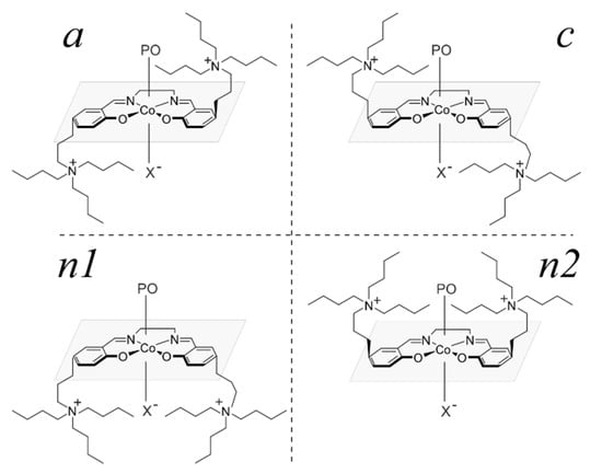 Schematic representation of stereoisomers resulting from spatial arrangement of cocatalyst units in organometallic cobalt complex with salen-type ligand adopting trans configuration (see Appendix A). For clarity, only one X–, bound to the metal is shown.