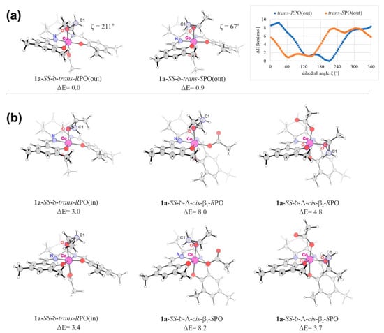 The minimum-energy structures for each considered isomer of the 1a complex are shown in Figure 7 and their relative energy and free-energy values are summarized in Table 1 together with those obtained for the analogous 1b structures. It should be emphasized that for each isomer there exist multiple (local) minima on the corresponding potential energy surfaces (PES). These structures differ in the orientation of the epoxide relative to the salcy-core of the catalyst. Therefore, a systematic conformational analysis was performed, including calculations of the energy profiles for the rotation of the epoxide around the Co-O(PO) bond with respect to the Co(III)-salcy fragment. Examples of such profiles are shown in Figure 7a. The relative energies of all the local minima corresponding to all computed rotational profiles for the considered isomers are presented in the Supplementary Materials (Table S1).