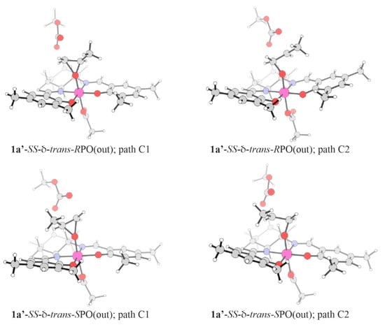In the case of SPO complexes, the lowest-energy structure is 1a-SS-δ-trans-SPO(out), which is slightly higher in energy than its RPO analogue (by 0.9 kcal/mol). 1a-SS-δ-trans-SPO(in) is higher in energy by 2.5 kcal/mol than 1a-SS-δ-trans-SPO(out). Both cis-β structures, 1a-SS-δ-Λ-cis-β2-SPO and 1a-SS-δ-Λ-cis-β2-SPO, are less stable, by 7.3 and 2.8 kcal/mol, respectively. The 1a isomers based on SPO demonstrate generally similar orientations of the epoxide C1-O-C2 ring relative to the Co-salcy plane to those observed in their respective RPO analogues, which seems to be consistent with the literature data [49,69]. The exception is the orientation of such a ring in the trans-(in)-type structures which could, however, be expected due to the presence of the epoxide methyl group facing inward of the Me-salcy ligand plane in these isomers.