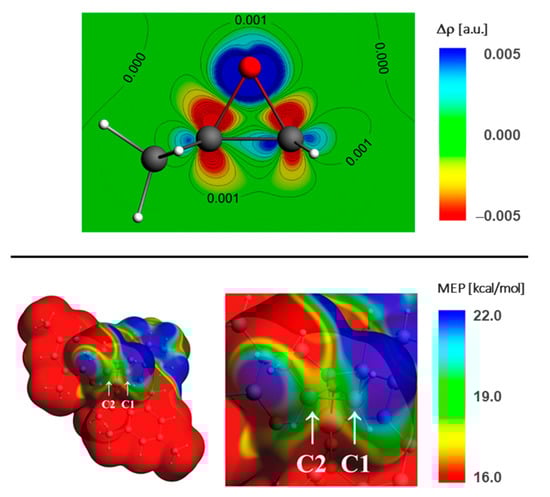The preference of the C1-pathway in the metal-free ring-opening reaction of asymmetric epoxides is known, and results mostly from the steric factors [48,49]. In the case of the models considered here we observe the strong preference of the C1-nucleophilic attack for most of the systems (except for the highly unstable cis-β2-SPO systems). The preference for nucleophilic attack at the C1-carbon atom in 1a’ and 1b’ can be nicely explained by the molecular electrostatic potential (MEP) distribution in the catalyst-epoxide complex. In Figure 9 we present the example of the deformation density map, Δρ = ρcomplex − (ρcatalyst + ρepoxide), and the MEP contour for the 1a-SS-δ-trans-RPO(out) complex. The Δρ plot shows the changes in the electron density due to the complex formation in the vicinity of the epoxide. It is clearly seen that the electron density is shifted from the carbon atoms (and the C-O bonds) towards the oxygen atom, forming a bond with the metal center of the catalyst. The outflow of the density from the two carbon atoms is approximately symmetrical (with slightly more negative density change on the C2 atom). In the Supplementary Materials (Figure S5) we additionally present the contour of the lowest-unoccupied-molecular-orbital (LUMO) density that shows slightly higher contribution in the vicinity of C1 atom compared to C2 (with major contribution in the Co-salcy area). The MEP contour indicates a strong preference of the nucleophilic attack on the C1 atom more clearly, as in its vicinity the MEP is visibly more positive than in the area surrounding the C2 atom.