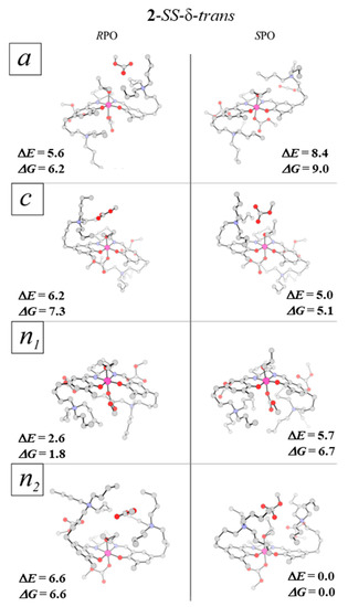 A comparison of the corresponding relative electronic-energy and free-energy values indicates that at the free-energy level, the difference between the most stable isomers, SS-δ-trans-RPO(out) and SS-δ-trans-SPO(out) becomes smaller and, in practice, negligible (0.5 kcal/mol in the case of 1a with the reversal of preference to the SPO complex, and 0.2 kcal/mol in the case of 1b with the preservation of RPO system preference). Furthermore, the free-energy value of the SS-δ-Λ-cis-β2-SPO becomes very close to the values observed for preferred structures, SS-δ-trans-RPO(out) and SS-δ-trans-SPO(out). The free-energy order of the higher-energy local minima remains the same as the energy-based sequence.