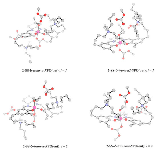 Based on the presented stereochemical considerations (see Section 2.1 and Appendix A), we focus our attention on SS-δ-trans- and δ-Λ-cis-β-type isomers; in the former case considering additionally two possible and nonequivalent coordination modes with the epoxide methyl group facing either inward (in) or outward (out) of the Schiff base ligand plane. The structure of the (in)-type was reported for similar salen-type complexes based on chromium(III) [49,68].