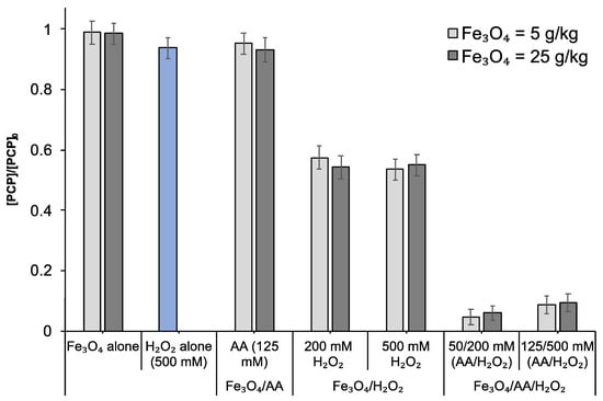 Degradation of PCP in contaminated soil (PCP = 6 mg Kg−1) evaluated in the presence of two different amounts of magnetite- Fe3O4 (5 or 25 g kg−1 soil w/w) by using single (Fe3O4 alone, H2O2 alone), binary (Fe3O4/AA and Fe3O4/ H2O2), and ternary treatments (Fe3O4/AA/H2O2). Experiments were performed in batch conditions at a liquid-to-solid ratio (L/S) of 1 (total solution volume = 2 mL) without pH adjustment (initial pH = 7.2) for 24 h. [PCP] represents the PCP concentration after oxidation (t = 24 h) and [PCP]0 is its concentration at t = 0 (before treatment) determined by HPLC.