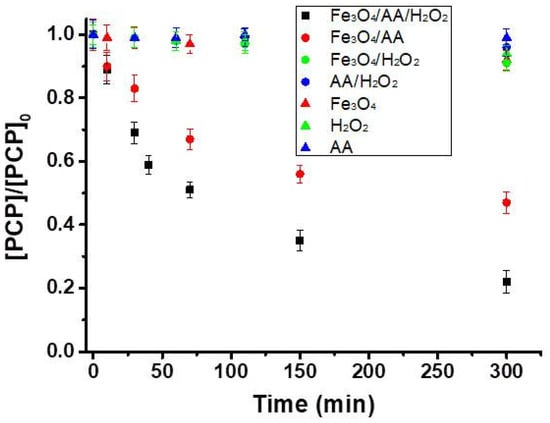 PCP removal in the single, binary, and ternary systems with 20 mg L−1 of PCP using 0.5 g L−1 of magnetite, 4 mM of ascorbic acid, and 4 mM of H2O2 at pH 7.2 (total solution volume = 100 mL). [PCP] represents the PCP concentration after oxidation at a specified oxidation time, and [PCP]0 is its concentration at t = 0 (before treatment) determined by HPLC.