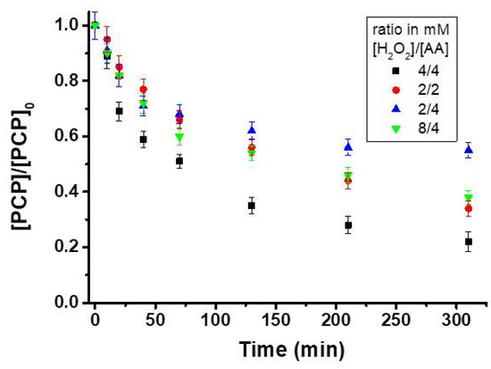 Effect of different [H2O2]/ascorbic acid (AA) ratio on the degradation of PCP (20 mg L−1) in the presence of 0.5 g L−1 of magnetite at pH 7.2 (total solution volume = 100 mL). [PCP] represents the PCP concentration after oxidation at a specified oxidation time and [PCP]0 is its concentration at t = 0 (before treatment) determined by HPLC.