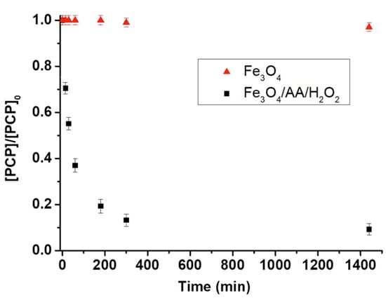PCP degradation in contaminated soil using Fe3O4 alone and Fe3O3/AA/H2O2. [PCP] represents the PCP concentration at a specified oxidation time and [PCP]0 is its concentration at t = 0 (before treatment) determined by HPLC. Experimental conditions are: Fe3O3 = 5 g kg−1 soil w/w, AA = 50 mM, H2O2 = 200 mM, liquid-to-solid ratio (L/S) = 1, total solution volume = 2 mL, and initial pH = 7.2.