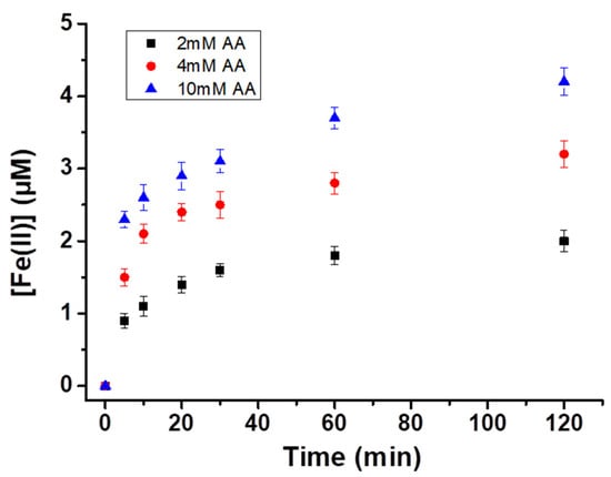 Evolution of Fe(II) concentration in the solution against time using various concentrations of ascorbic acid (2, 4, and 10 mM) in the presence of 0.5 g L−1 magnetite and 20 mg L−1 of PCP (total solution volume = 100 mL).