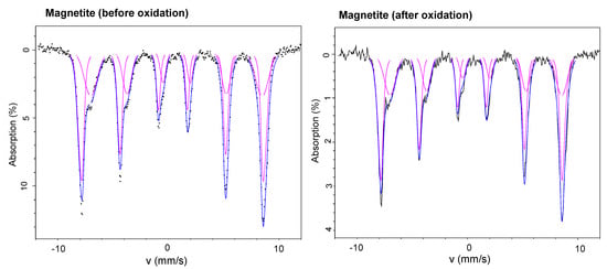 Magnetite samples before and after chemical oxidation were characterized by the Mössbauer spectroscopy (Burlington, MA, USA). For this, dried powders were loaded into Plexiglas holders (1 cm²). Samples were then transferred to the instrument and loaded inside a closed-cycle exchange gas cryostat (Janis cryogenics Co., Woburn, MA, USA). Measurements were collected at 140 K with a constant acceleration drive system (WissEL, Wissenschaftliche Elektronik GmbH, Starnberg, Germany) in a transmission mode with a 57Co/Rh source and calibrated against a 7-µm thick α-57Fe foil measured at room temperature. All spectra were analysed using Recoil (University of Ottawa, Ontario, Canada) by applying an extended Voight Based Fitting (xVBF) routine [32]. The half width at half maximum (HWHM) was fixed to a value of 0.13 mm/s for all samples.