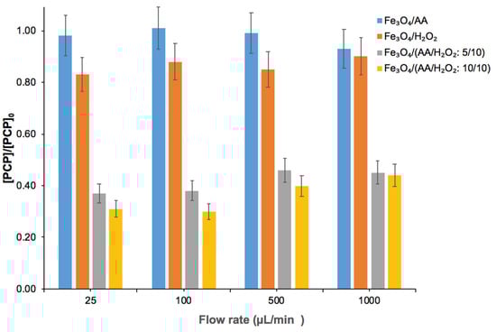 Degradation of PCP in saturated soil columns by using Fe3O4/AA, Fe3O4/H2O2, and Fe3O4/(AA/H2O2: 5/10 or 10/10 mM) at different flow rates (25, 100, 500, and 1000 µL min−1). For the first two treatments, 10 mM of both AA and H2O2 were used. For all columns, 5 g of PCP-contaminated soil (initial pH 7.2) pre-mixed with magnetite (5 g kg−1 soil w/w) was used. [PCP] represents the PCP concentration after oxidation and [PCP]0 is its concentration at t = 0 (before treatment) determined by HPLC.