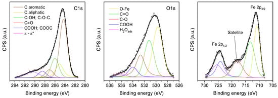XPS spectra (Figure 1) were very similar for all the Fe/AC-f catalysts, Fe/CN-B was chosen as example to qualitatively show the multiple signals observed for major components, C1s, O1s, and Fe2p. The C1s region presented the typical shape for AC, with the six signals at 284.4 eV, 285.2 eV, 286.0 eV, 287.1 eV, 288.5 eV, and 290.5 eV usually assigned to aromatic C, aliphatic C (defects), C-OH or C-O-C, C=O, COOH, or COOC and π→π*, respectively [,]. Regarding the O1s spectral region, five contributions could be found (Table 3). The peak at 530.0 eV was identified as Fe-O, and the relative percentage corresponds to the surface iron content encountered (Table 2). 531.5 eV and 532.9 eV signals were assigned to C=O and C-O, with analogous contributions for all the catalysts. The highest difference appeared for oxygen signal at 534.0 eV, due to COOH. In this case Fe/CM-B and Fe/CN-B catalyst, functionalized with ethylenediamine, exhibited a significantly lower contribution, whose formation could be induced during impregnation with Fe(NO3)3·9H2O and further heat treatment []. Finally, the contribution of adsorbed H2O was at 536.0 eV, also lower in the basic functionalized catalysts (Fe/CM-B and Fe/CN-B). Concerning iron spectral region, Fe3+ was confirmed in all the Fe/AC-f catalysts according to Fe2p peaks position (Table 4), at 711.2 ± 0.2 eV and 724.6 ± 0.1 eV and the satellite pike at 718.2 ± 0.2 eV [,,,].