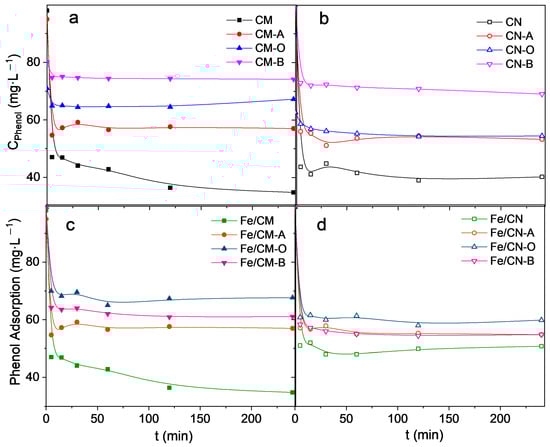 Evolution of phenol CWPO reaction on AC and AC-f supports: (a) CM-f and (b) CN-f. And evolution of phenol adsorption on Fe/AC-f catalysts: (c) Fe/CM-f catalysts and (d) Fe/CN-f catalysts. Reaction conditions: 50 mL reaction volume, 100 mg·L−1 phenol, 500 mg·L−1 catalyst, 500 mg·L−1 H2O2, pH 3, 200 rpm, 50 °C.