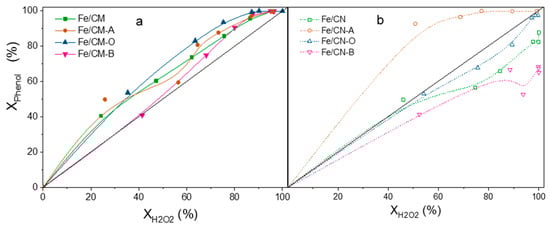 Degradation of phenol with the consumption of H2O2: (a) Fe/CM-f catalysts and (b) Fe/CN-f catalysts. Reaction conditions: 50 mL reaction volume, 100 mg·L−1 phenol, 500 mg·L−1 catalyst, 500 mg·L−1 H2O2, pH 3, 200 rpm, 50 °C.