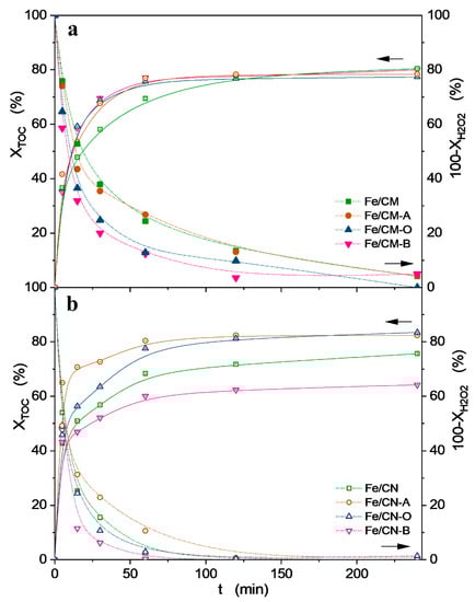 Evolution of TOC and consumed H2O2 along reaction time: (a) Fe/CM-f catalysts and (b) Fe/CN-f catalysts. Reaction conditions: 50 mL reaction volume, 100 mg·L−1 phenol, 500 mg·L−1 catalyst, 500 mg·L−1 H2O2, pH 3, 200 rpm, 50 °C.