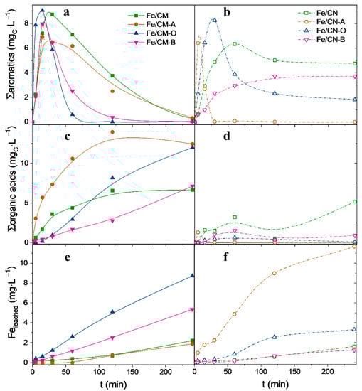 Evolution of CWPO intermediates along reaction time: Aromatics on (a) Fe/CM-f catalysts, and (b) Fe/CN-f catalysts. Short-chain organic acids on (c) Fe/CM-f catalysts and (d) Fe/CN-f catalysts. Iron leachate on: (e) Fe/CM-f catalysts and (f) Fe/CN-f catalysts. Reaction conditions: 50 mL reaction volume, 100 mg·L−1 phenol, 500 mg·L−1 catalyst, 500 mg·L−1 H2O2, pH 3, 200 rpm, 50 °C.