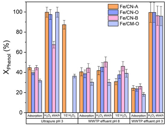 Effect of water matrix and pH of the reaction medium in the phenol removal by CWPO reaction (240 min). Reaction conditions: 50 mL reaction volume, 500 mg·L−1 catalyst, 500/250 mg·L−1 H2O2, 200 rpm, 50 °C, 240 min reaction time. Initial TOC: 80 mg·L−1 ultrapure water matrix, 90 mg·L−1 WWTP effluent.