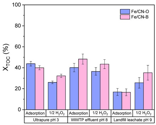 Regarding landfill leachate, it was previously 1:20 diluted with deionized water to obtain a TOC concentration (100 mg·L−1) in the range of previous experiments, which also facilitate the analytical measurements [,], without any pH modification. Figure 8 shows a significant removal of the TOC, naturally present in the landfill leachate, by CWPO, at original pH 9 []. The degradation of organic matter was higher than in the case of WWTP effluent at unmodified pH 8, and even in the ultrapure water at pH 3, where the adsorption step had a higher contribution to TOC elimination than CWPO. Therefore, it could be concluded that the sequence for TOC reduction by CWPO follows the order: Landfill leachate water, pH 9 > WWTP effluent, pH 3 > ultrapure water, pH 8. The obtained results reinforce the robustness of CWPO treatment for removal of contaminants applied to real water matrices but their composition also plays an important role in the process.