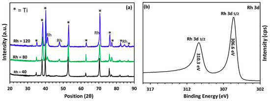 (a) XRD patterns of the rhodium (Rh) thin films prepared on Ti foil substrates for 40, 80, and 120 min (Rh-40, Rh-80, and Rh-120) at 500 °C, (b) high-resolution X-ray photoelectron spectroscopy (XPS) spectrum of Rh-80 indicating the elemental oxidation state of Rh.