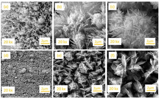 FE-SEM images of metallic Rh films, acquired from two different substrates (a–c) Ni foam and (d–f) Ti foil for deposition times of 40 min (a,d), 80 min (b,e), and 120 min (c,f).