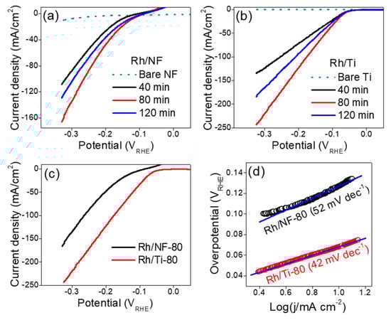 Linear sweep voltammetry (LSV) curves of Rh/nickel foam (NF) (a) and Rh/Ti (b) electrodes showing the effect of film deposition time (40, 80, and 120 min) on the hydrogen evolution reaction (HER) performance, comparative LSVs of Rh/NF and Rh/Ti prepared after 80 min deposition (c), and Tafel slopes (d).