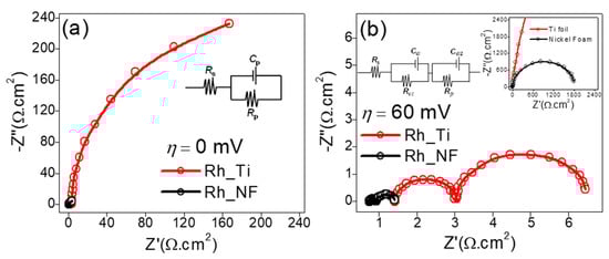Nyquist plots of Rh/NF and Rh/Ti electrodes recorded at η = 0 mV (a) and η = 60 mV. Nyquist plots of pristine (without electrocatalysts) NF and Ti (inset Figure (b)). Cp = capacitive or electrical double layer element, Rs and Rp are resistive elements, Cdl = electrical double layer capacitance, Rct = charge transfer resistance.