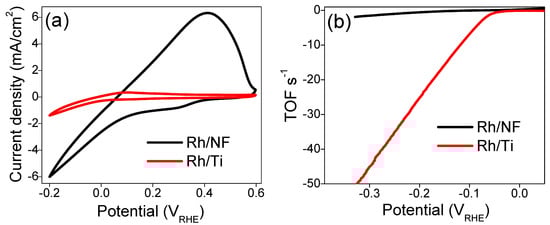 Comparative cyclic voltammetry (a) and corresponding turnover frequency (TOF) vs. η (b) of Rh/NF-80 and Rh/Ti-80 electrodes. The CVs were measured between −0.2 and 0.6 VRHE at pH = 7 in a phosphate buffer solution with scan rate of 20 mV s−1.