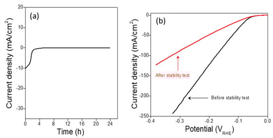 The electrochemical stability of best performing Rh/Ti-80 electrode was investigated at a constant overpotential of 67mV in 0.5M H2SO4 solution. The current-time profile and linear sweep voltammograms obtained before and after stability test are shown in Figure 6a,b, respectively.