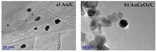 The TEM examination showed spherical AuNPs with a diameter less than 20 nm for the Au/C (Figure 1a) and AuCeO2/C (Figure 1b) catalysts. The high-resolution TEM (HRTEM) images [31] revealed the differences between the size of Au crystallites and AuNPs. It has been found that AuNP was composed of several Au crystallites of different orientations. Additionally, the AuNPs presented a polycrystalline structure with the characteristic lattice spacing of ~0.23 nm, corresponding to the (111) plane of Au [31,32].