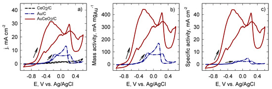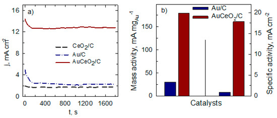 The obtained ESA values were 0.05 and 0.19 cm2 for AuCeO2/C and Au/C, respectively [31]. The Au loading in the prepared catalysts determined using ICP-OES was equal to 71 and 78 µg cm−2 for AuCeO2/C and Au/C, respectively [31].