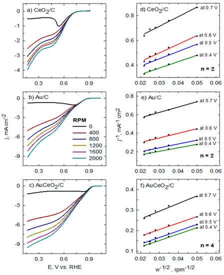 Then, liner sweep voltammograms were scanned in the O2− saturated 0.1 M NaOH solution from 1.0 V in the cathodic direction to 0.2 V vs. the reversible hydrogen electrode (RHE) at a scan rate of 5 mV s−1. The rotation speed was varied from 400 to 2000 rpm (Figure 7). The obtained ORR response coincides with that reported in the literature of 0.7 and 0.9 V, indicating that the ORR response was dominated by the kinetics of electrocatalysts (Figure 7a–c) [29,30,40]. Furthermore, the ORR polarization curves were used to obtain the Koutecky–Levich (K−L) plots for each catalyst (Figure 7d–f). In general, a good linear fitting was seen between j−1 and w−1/2, indicating the first-order dependence of the ORR kinetics at different potentials (0.4–0.7 V). The calculated electron transfer number (n) for the CeO2/C and Au/C catalysts was approximately two, indicating that these catalysts favor a two-electron transfer reaction path and O2 is reduced to HO2− and OH− [41,42]. Meanwhile, the calculated n for the AuCeO2/C catalysts was approximately 3.8, indicating the 4 e− transfer reaction and direct reduction of O2 to H2O on the surface of this catalyst [43,44].