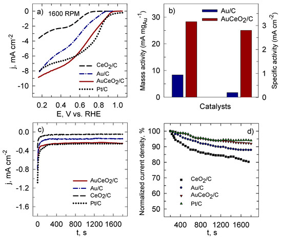 Comparison of linear sweep voltammetry (LSV) curves recorded on the CeO2/C, Au/C, AuCeO2/C, and Pt/C catalysts in an O2-saturated 0.1 M NaOH solution at 1600 rpm (a); LSV oxygen reduction current densities at 0.8 V normalized by Au loadings and electrochemically active surface areas (ESAs) of AuNPs for the Au/C and AuCeO2/C catalysts (b); chronoamperometric curves recorded on the investigated catalysts at 0.55 V in an O2-saturated 0.1 M NaOH solution (c); chronoamperometric responses (percentage of current density retained vs. operation time) of all the catalysts (d).