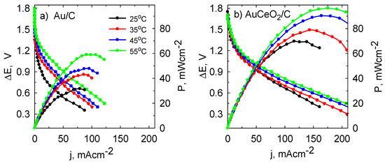 Finally, the performance of the NaBH4-H2O2 fuel cell was evaluated using the AuCeO2/C and Au/C catalysts as the anode material. The fuel cell polarization curves and the corresponding power densities against the current density at temperatures in a range of 25–55 °C are given in Figure 9. The fuel cell maintained an open circuit voltage approximately at 1.55 V for the Au/C catalyst (Figure 9a) and 1.7 V for the AuCeO2/C catalyst (Figure 9b). It can be seen that NaBH4-H2O2 fuel cell power density values increased exponentially with increasing temperature. The achieved peak power density of 69.8 mW cm−2 at 25 °C for AuCeO2/C was two times greater as compared with that (31.6 mW cm−2) obtained for Au/C. Increasing the temperature from 25 to 55 °C, the power density increases approximately 1.5 and 2 times for the AuCeO2/C and Au/C catalysts, respectively. More detailed electrochemical parameters of the NaBH4-H2O2 fuel cell using Au/C and AuCeO2/C catalysts as an anode are listed in Table 1. In general, power density peak values obtained in this study were higher compared with those for fuel cells described in the literature [45,46,47].