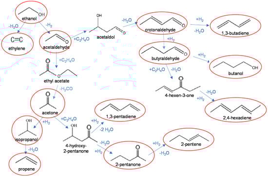 The conversion of ethanol followed the main pathways schematized in Figure 3. Ethylene and acetaldehyde were the primary products of dehydration and dehydrogenation reactions, respectively. Further reactions of acetaldehyde can follow different pathways, through aldol coupling or ketonisation reactions. Self-condensation of acetaldehyde to acetaldol (3-hydroxy-butanal) leads to the formation of crotonaldehyde (2-butenal), which is hydrogenated to crotyl alcohol (butenol) or butyraldehyde (butanal), leading to the formation of, respectively, butadiene or longer-chain unsaturated hydrocarbons. Ketonisation of acetaldehyde leads to formation of acetone, which is further converted by transfer hydrogenation and dehydration to propylene or by aldol cross-coupling with acetaldehyde to 2-pentanone and unsaturated C5 hydrocarbons.