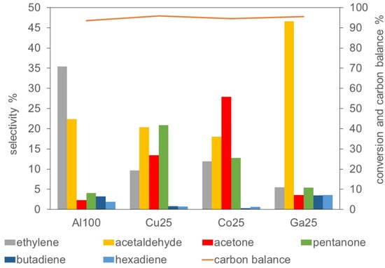 As evidenced in Figure 4, ethylene, the primary dehydration product of ethanol, was the main product for Al100, with a selectivity of 37%. The partial replacement of Al by Cu, Co or Ga brought about a drastic decrease of ethylene yield, the main products being acetaldehyde and acetaldehyde-derived oxygenates. Acetaldehyde was converted to products of consecutive reactions at very different extent according to the nature of the catalyst. On Al100 and Ga25, less than half acetaldehyde was converted to further products. On Cu25 and Co25, nearly 75% acetaldehyde was converted. The main products of acetaldehyde conversion were acetone and 2-pentanone, formed by ketonisation and further aldol condensation reactions. Acetone further reacted to form 2-pentanone at a different extent according to the type of catalyst. In all cases, the carbon balance was nearly 95%, approaching the maximum possible value. In the evaluation of the carbon balance, it has to be taken into account that the formation of odd-carbon number molecules, like acetone or 2-pentanone, brings about the loss of single-carbon molecules, which were not analyzed. This effect accounts for most of the carbon balance deficit on substituted catalysts.