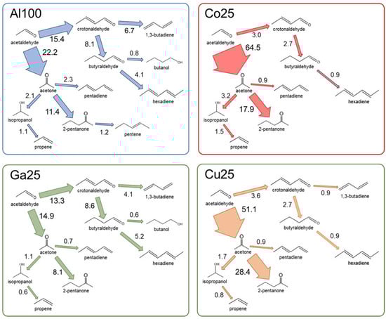Most acetaldehyde was not converted to other products on Ga25 and Al100. The percent fraction of acetaldehyde converted to further products increased in the order 27.1 < 36.7 < 53.6 < 66.8 for, respectively, Ga25, Al100, Cu25 and Co25. In all the cases, more acetaldehyde was converted through the ketonisation pathway than through self-condensation to acetaldol. Other La-based perovskites have indeed been recognized as effective ketonisation catalysts []. However, the ratio of conversion between the two pathways was extremely different from one catalyst to another. Conversion through the ketonisation pathway was 1.3 or 1.5 times more effective than the acetaldol pathway in the case of Ga25 or Al100, but was 15 or 20 times more effective for Cu25 or Co25.