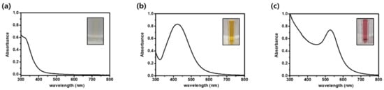 Ultraviolet–visible (UV–Vis) absorption spectra of (a) Sargassum serratifolium (SS) extract, (b) SS-AgNPs (SS-silver nanoparticles) and (c) SS-AuNPs (SS-gold nanoparticles).