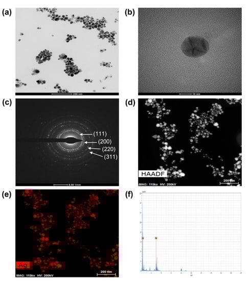 High-resolution transmission electron microscopy (HR-TEM) images (a,b), selected area electron diffraction (SAED) pattern (c), HAADF (High-angle annular dark-field) images (d,e) and energy-dispersive X-ray spectroscopy (EDX) spectra (f) of SS-AgNPs. 58 k (a), 630 k (b), 115 k (d,e).